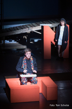 Ein Sturm stürzt die Bühne ins Chaos. Dieser wurde heraufbeschworen vom Zauberer Prospero, der von seinem Bruder Antonio (Stephan Fiedler) und Alonso, dem König von Neapel (Katja Bramm) um sein Herzogtum Mailand gebracht wurde. Nun lässt Prospero seine Kontrahenten durch den Sturm an den Strand seiner Exil-Insel pusten, um zum ultimativen Racheschlag auszuholen. Hilfreich zur Seite stehen ihm dabei der Luftgeist Ariel und der animalische Hexensohn Caliban. Anna-Lena Zühlkes Gesang als Ariel, der die Schiffbrüchigen anlockt, überzeugt in Kombination mit den Sounds von Sven Springer ebenso, wie ihr teils unterwürfiges, teils manipulatives Spiel. Raffiniert sind auch Voodoo-Video-Projektionen, die Ariel immer wieder behutsam neu arrangiert, als auch das Spiel mit Licht und Rauch. Sven Reese gibt den Zauberer überzeugend als Wissenschaftler im Wahn, Kevin Körber den Caliban als Kreatur außer Rand und Band. Umschnitt, Realität: Nun ist der Zuschauer Gast in einer Selbsthilfegruppe Spielsüchtiger, die nachvollziehbare Gründe für das Spielen nennen: Langeweile, Spaß, gewinnen, etwas bewegen, als Computer-Avatar alles tun und alles sein können.