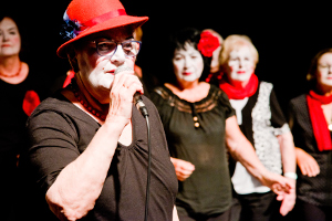 Der Raum ist groß und hell, am Rand stehen Tische und Stühle, in der Mitte ist viel Platz, dahinter eine große Fensterfront mit roten Vorhängen, davor steht ein Klavier. Durch den Raum hallen fröhliche „Guten Morgen!“-Wünsche, Lachen und aufgeregte Gespräche. Geld für ein Gruppengeschenk wird eingesammelt, Kaffeebestellungen aufgenommen. Die Seniorinnen plus ein Senior wirken unkompliziert, engagiert, eine Teilnehmerin kommt gleich freundlich und neugierig auf mich zu und fragt, wer ich bin und was ich hier mache. Auch Martin Gey, Pressesprecher der Volkssolidarität, ist vorbeigekommen. Die Idee für die Seniorentheatergruppe habe der Leipziger Stadtverband des Sozialträgers im Zuge seines 70. Jubiläums gehabt. Um eine hohe Professionalität zu gewährleisten, holte man das Schauspiel Leipzig mit ins Boot. Projektbeginn war 2014, die erste Premiere 2015. Dieses Jahr wird mit der „Revue der kleinen Dinge“ das dritte selbst entwickelte Stück zur Aufführung gebracht.