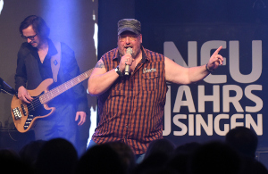 Nun also ist das Dutzend voll. Zum zwölften Mal Neujahrssingen der etwas trashigen Art, mit manch schrägen Tönen und aberwitzigen Outfits. Brechend voll war wieder das Haus Leipzig, als sich die Gastro- und Kulturszene mit Medienvertretern livehaftig mit Band und den wie immer großartigen Background-Sängerinnen Jasmin Graf und Berivan Kernich einfand. Und wie immer führten Maike Beilschmidt (mit eindeutiger Buchstaben-Botschaft auf dem Shirt) und Mark Daniel (im Glanzhemd) durch den permanent publikumslauten Abend. Moderationen der beiden zu verstehen war Glückssache.