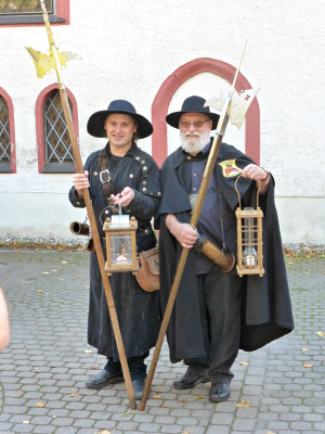 Nachtwächter ehrenhalber sind ein Völkchen für sich. Auf abendlichen Stadtrundgängen mit ihnen geht es nicht bierernst zu, da wird Geschichte mit Geschichten gewürzt und verbreitet. Bei Anekdoten und manchen Schnurren haben sie die Lacher auf ihrer Seite. Und wenn sie mal unter sich sind wie im vorliegenden Fall zu einem besonderen Anlass, dann geht es nochmal so hoch her.